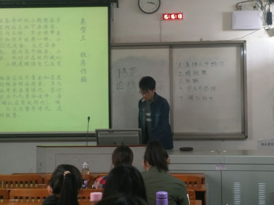 主题班会现场,让全体参会的同学观看了一个短视频,简单了解电信诈骗的手段和危害,让同学们有个更直观的认识。随后,以多个电信诈骗的案例,让同学们了解电信诈骗给普通百姓带来的巨大危害,甚至给社会造成的恶劣影响。最后同学们就电信诈骗的手段、方法、危害、预防等展开积极的讨论。整个讨论会场很活跃。